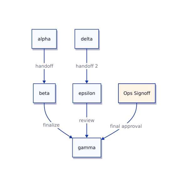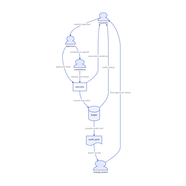 Human-in-the-loop execution handoff with approval controls. Enterprise variant that adds change board review and audit pack delivery.