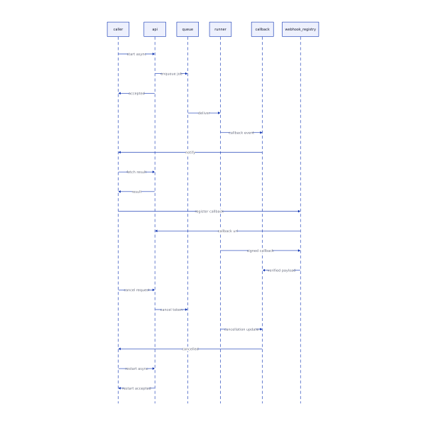 Asynchronous callback lifecycle from acceptance to completion fetch. Enterprise variant that adds cancellation and restart paths for long-running jobs.