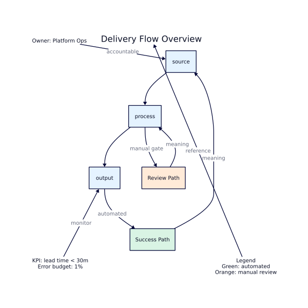 Annotated rollout brief that combines prose and executable snippets. Enterprise variant that adds decision log integration for release accountability.