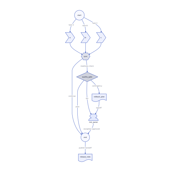 Parallel control execution before production release. Enterprise variant that adds rollback planning and release-note governance.
