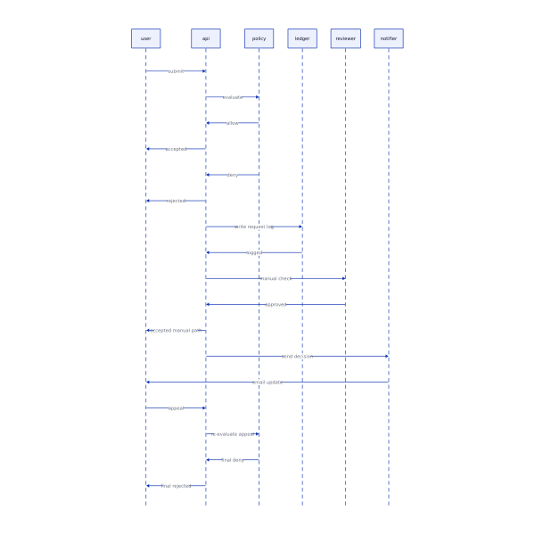 Access request sequence with allow, deny, and escalation paths. Enterprise variant that adds appeal loop and outbound notification interactions.