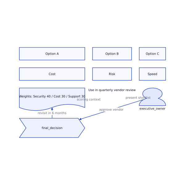 Presentation matrix for vendor comparison and decision workshops. Enterprise variant that adds executive approval handoff and periodic reassessment flow.