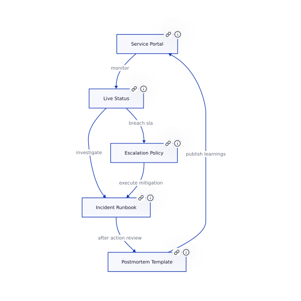 Interactive note board linking operational artifacts and status views. Enterprise variant that adds postmortem publishing loop back to service portal.
