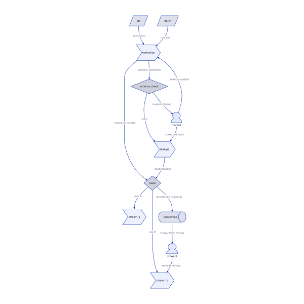 Lead ingestion unification from API, batch, and manual channels. Enterprise variant that adds quarantine queue handling and stewardship-based rerouting.