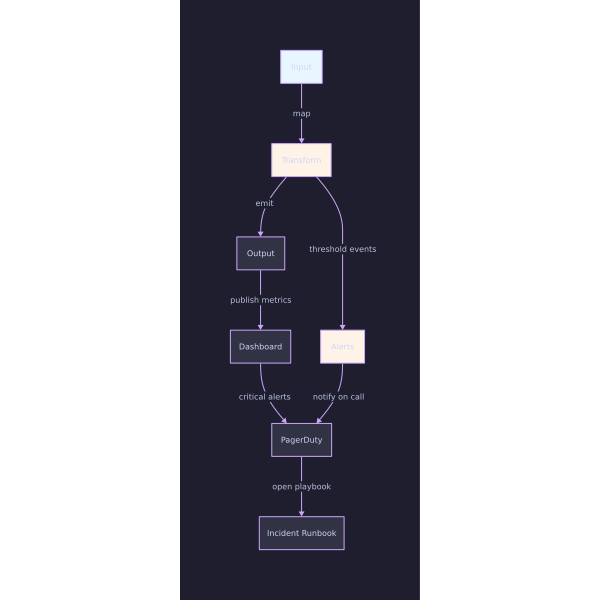 Config-focused diagram showing variable-driven transformation flow. Enterprise variant that adds incident paging and runbook linkage for critical thresholds.