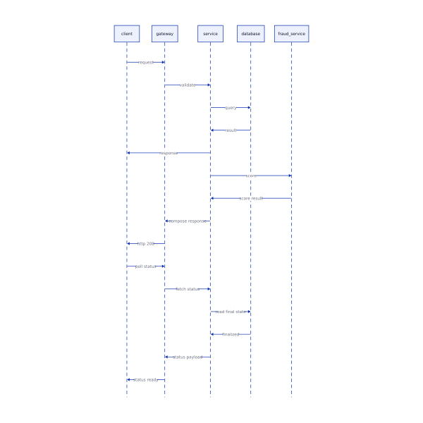 Synchronous checkout request sequence across gateway and services. Enterprise variant that adds status polling and finalization lookups for client confirmation.